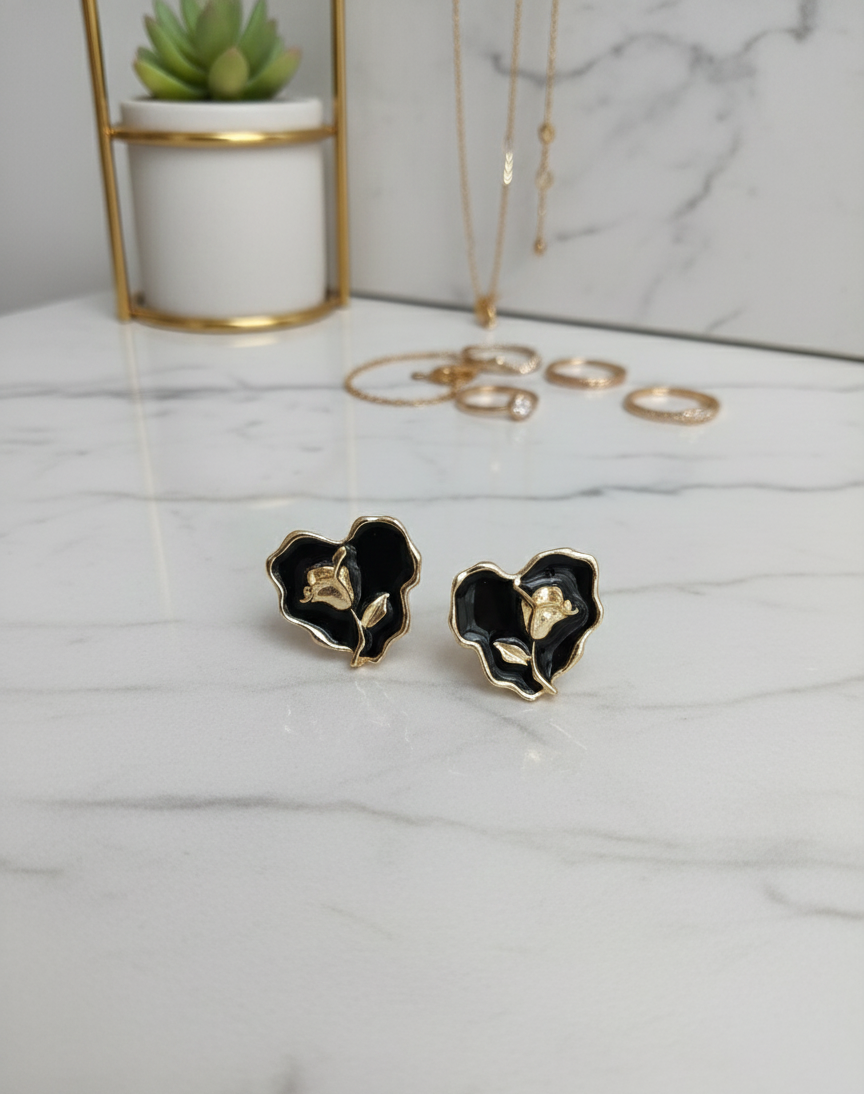 Black Enamel & Gold Rose Heart Studs