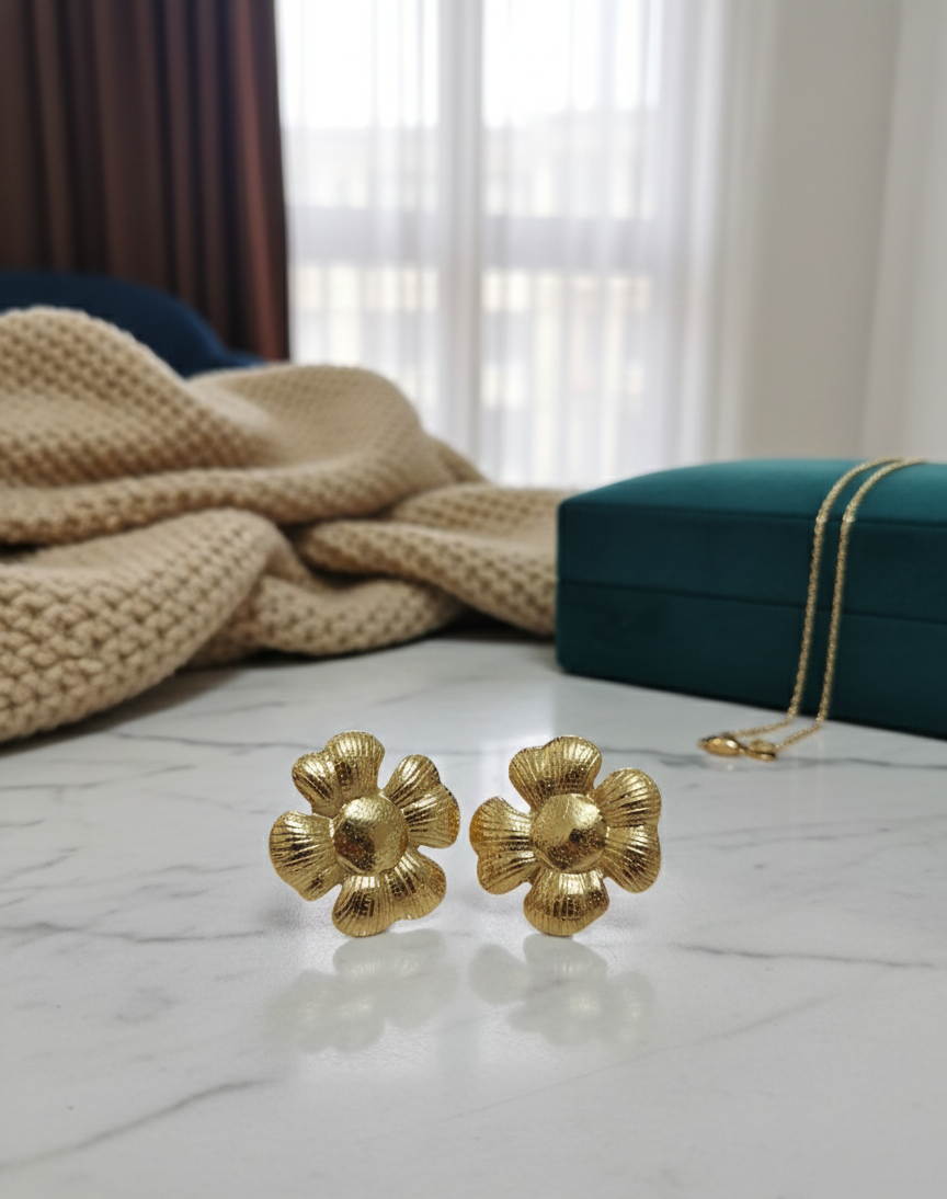 Gold Toned Textured Flower Stud Earrings
