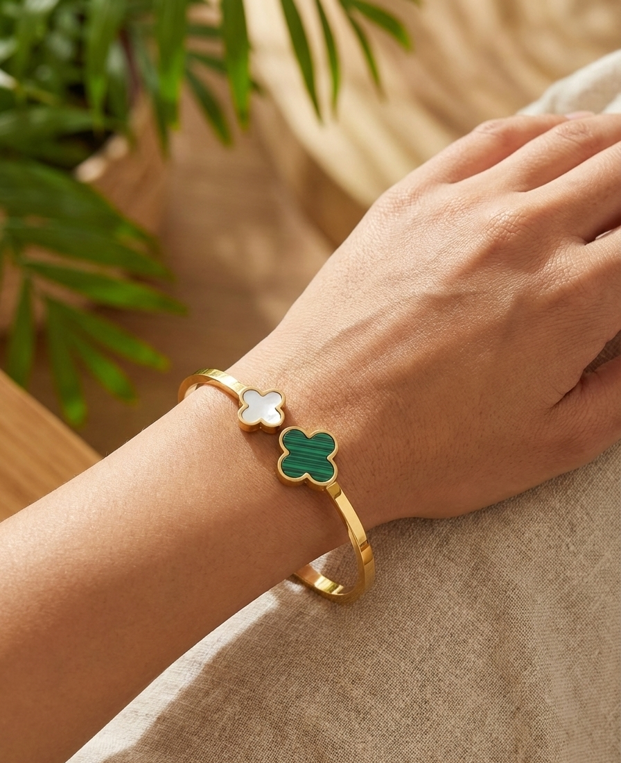Chic Dual-Clover Design: Features a trendy open-cuff style with two distinct floral motifs—one showcasing a vibrant malachite green inlay and the other a classic white shell finish.