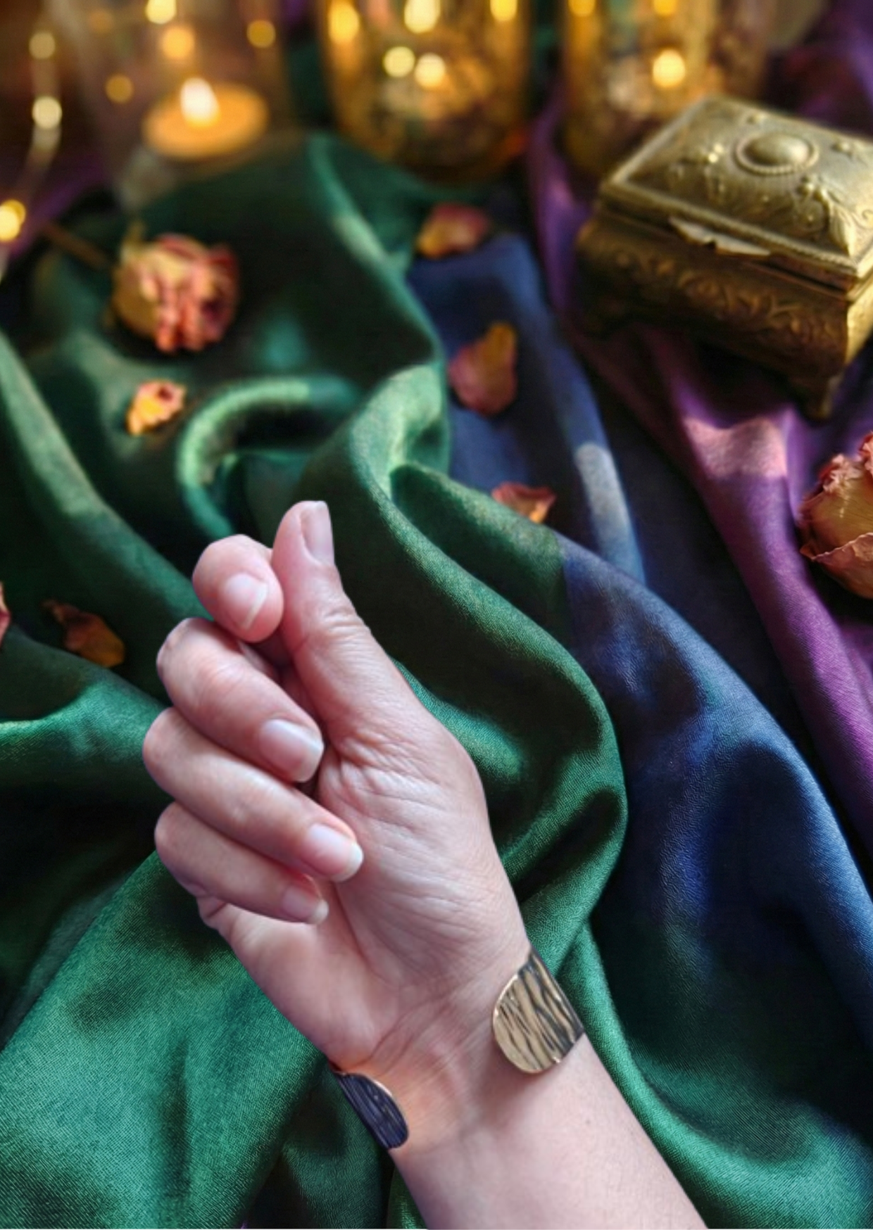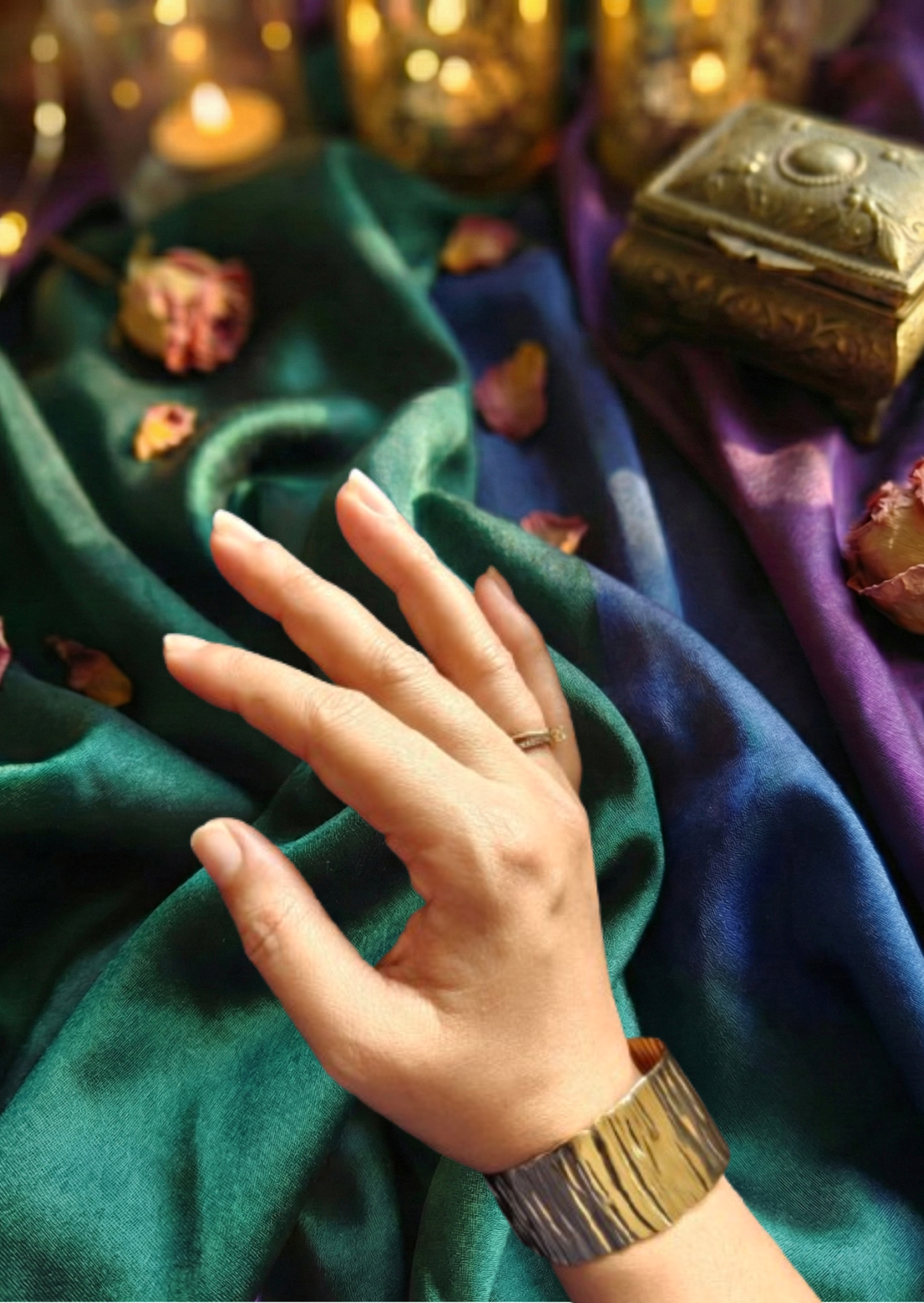 Sculptural Silhouette: A wide statement cuff with organic, wavy edges that creates a modern, artistic look.