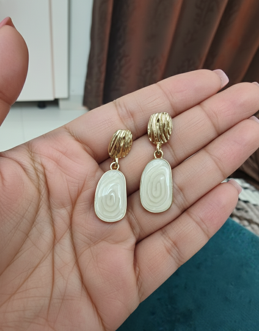 Organic Geometry: Features an irregular, bark-textured gold stud suspending a smooth, ivory-hued oval drop, creating a harmonious balance between rugged texture and sleek curves.
