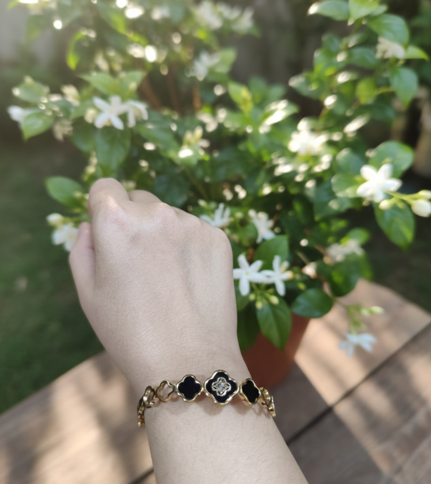 Elegant Design: Features a luxurious gold-tone finish with five stunning clover motifs—including rich black enamel inlays and an intricate central filigree pattern.