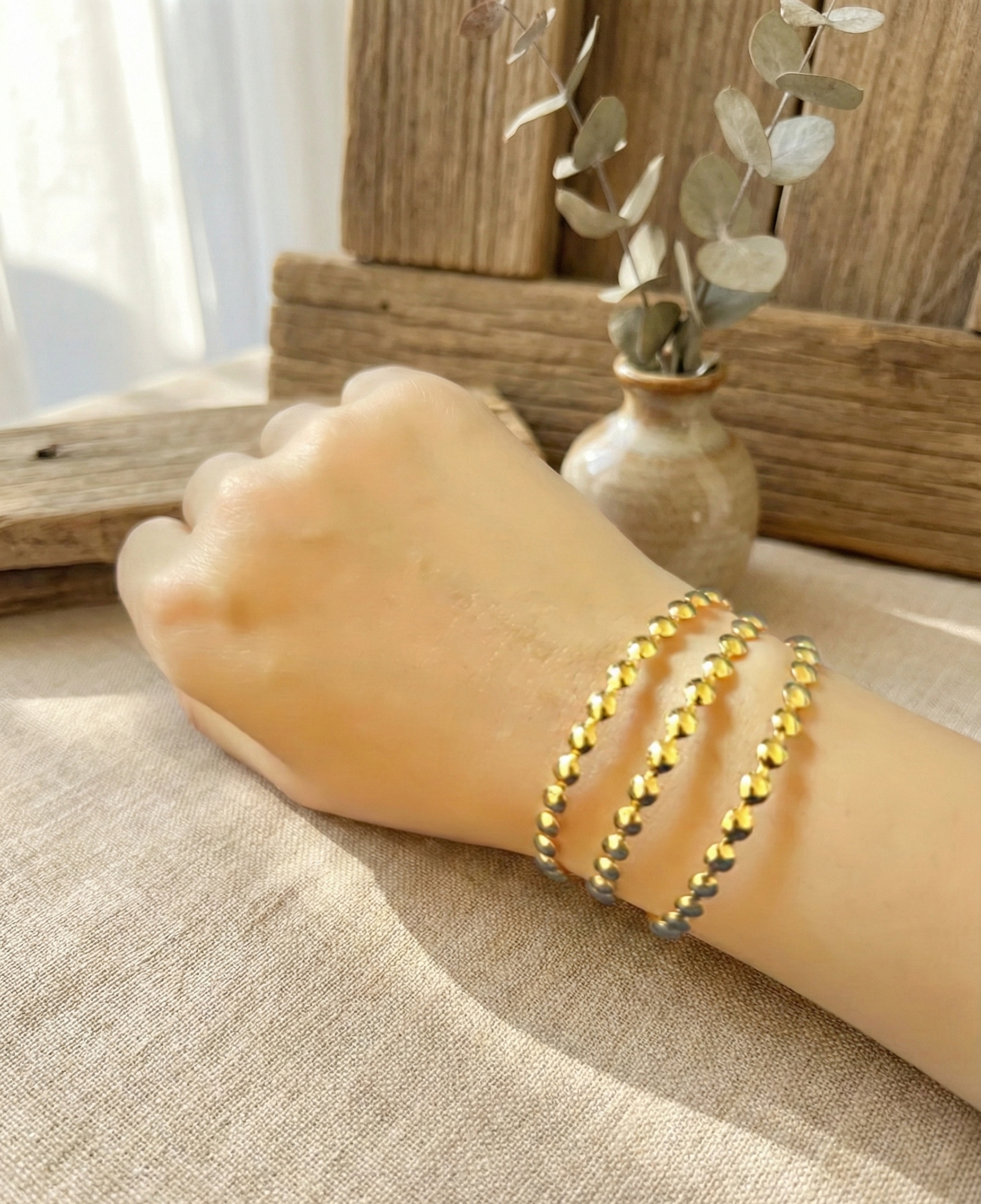 Bead Detail: Each row is composed of uniform, high-polish gold-toned spheres that provide a smooth and reflective surface.