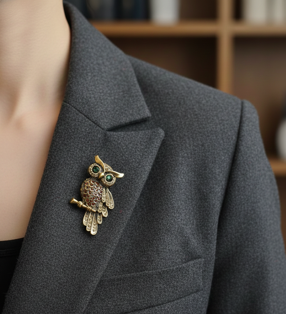Add a touch of timeless charm to your accessories collection with this elegant vintage-style owl brooch. Crafted with intricate metalwork designed to evoke an antique feel, this wise little bird is the perfect accent piece. The design is highlighted by two striking green gem eyes that add a captivating pop of color and sparkle. Securely pin it to a blazer lapel, scarf, hat, or handbag for an instant dose of retro flair. It makes a thoughtful gift for owl lovers and vintage jewelry enthusiasts alike